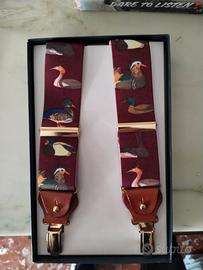 Bretelle elastiche da uomo con un tema ispirato alla natura e alla caccia, caratterizzate da una stampa con diversi tipi di anatre.