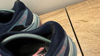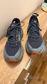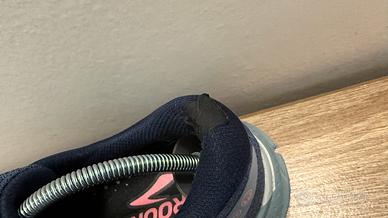 Tenute discretamente , sul tallone di entrambe è stato messo un pezzetto di stoffa adesiva nera (vedi foto) Taglia 42,5 Per 20€ sono ancora ottime scarpe