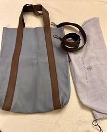 Vendo tote bag in pelle di Brunello Cucinelli, caratterizzata da un design moderno bicolore azzurro e marrone. È un modello versatile che può essere utilizzato come borsa a mano o a tracolla, grazie alla tracolla regolabile e rimovibile, pagata in store 4.250