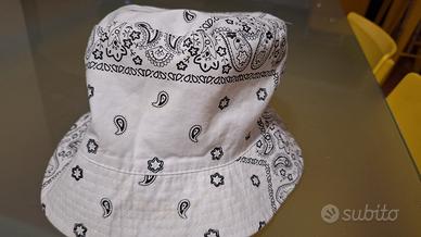 Bucket hat in cotone bianco con classica stampa bandana nera, stile streetwear.