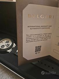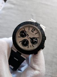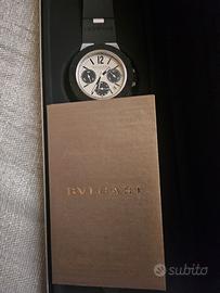 Bulgari Alluminio Gomma Cronografo automatico Cinturino in gomma Cassa in alluminio satinato, diametro della cassa senza corona 41 mm, spessore della cassa 12,9 mm. Lunetta in gomma nera con scritta "Bulgari". Cinturino in gomma nera, anse avvitate, fibbia ad ardiglione in alluminio con logo del produttore. Quadrante bianco crema con numero arabo 12, indici luminescenti e lancette nere. Movimento automatico, cronografo, riserva di carica 42 ore. Indicazione delle ore e dei minuti tramite lancette dal centro, piccoli secondi con arresto dei secondi per la regolazione precisa dell'ora a ore 3, datario con regolazione rapida tra le ore 4 e le ore 5. Vetro zaffiro antigraffio. Corona a vite con protezione laterale. Fondello in titanio con rivestimento DLC nero e incisione. Peso dell'orologio compreso il cinturino 81 g. Impermeabile fino a 100 metri. Numero di referenza : 103722. Scatola originale Bulgari in alluminio e documenti di garanzia fino ad agosto 2027 almeno e per sicurezza devo vedere perche' e' sul Qr code, set completo. Mai indossato. Consegna immediata. Include libretto di garanzia dell'orologio, descrizione dettagliata e costo dell’orologio 5.500 € garanzia ancora 2 anni nel libretto Ed ANCHE POCHETTE DA VIAGGIO NUOVA NATURALMENTE come da Foto che Non ha nessuno perche' si paga a parte circa 100 euro il costo della Pochette da viaggio.