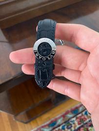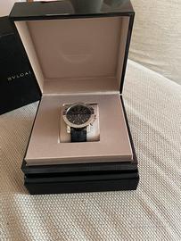 cassa in acciaio, corona con pietra di colore nero, lunetta con incisa firma Bulgari, quadrante nero lucido con logo applicato, indici in acciaio applicati, datario tra ore tre e ore cinque, movimento a carica automatica cal. BVL 328, cinturino in pelle originale di colore nero, fibbia deployant in acciaio marcata Bulgari, vetro minerale. Corredato di scatola e garanzia. Diam. mm 41,5