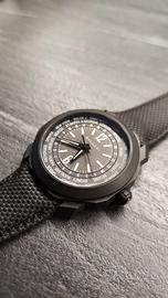Bulgari Octo Roma Worldtimer (Ref. 103486) con movimento meccanico di manifattura a carica automatica, World Timer, 24 fusi orari e indicatore 24 ore, cassa in acciaio inossidabile con trattamento Diamond-Like Carbon sabbiato nero, quadrante sabbiato opaco nero, indici e lancette rivestiti di Super-LumiNova® (SLN), fondello a vista, corona a vite in acciaio inossidabile con trattamento DLC e inserto in ceramica, cinturino testurizzato in caucciù nero. Impermeabile fino a 100 metri.