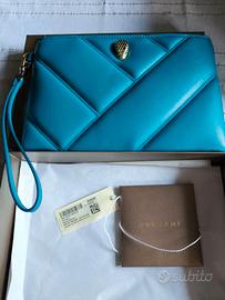 Clutch/Flat Pouch Serpenti Cabochon in morbida pelle di vitello color Laguna Blu con maxi motivo matelassé e interno in nappa color Laguna Blu. La clutch è impreziosita da un accattivante rivetto a testa di serpente in ottone placcato oro chiaro impreziosito da occhi in smalto rosso, chiusura con zip.