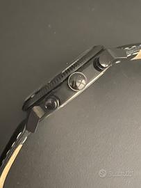 Questo magnifico cronografo monta un movimento al quarzo, ha una cassa in acciaio con trattamento in PVD nero da 43mm escluso corona, per 49mm alle anse, corona a vite logata da 7mm x 3mm, anse da 22mm, quadrante nero con datario ad ore 9 e cinturino in pelle nera con fibbia logata.