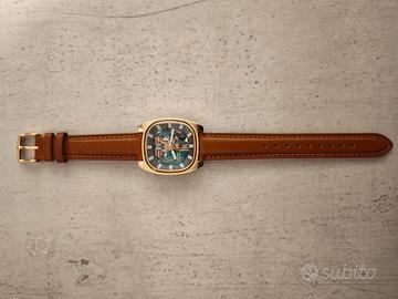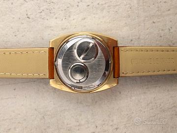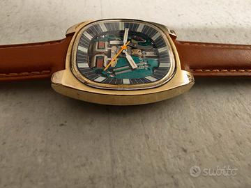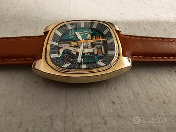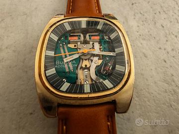 Bulova accutron spaceview modello swiss made 7323 N3 del 1973 con cassa placata oro 10 kt da 36x42 mm. Originale e perfettamente funzionante, cassa e cristallo presentano leggeri graffi dovuti al tempo e a normale utilizzo. Il cristallo ha un difetto nel bordo a ore 10, che non ne compromette la tenuta.Bracciale nuovo il pelle marrone, generico.