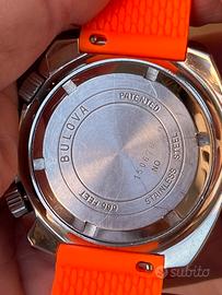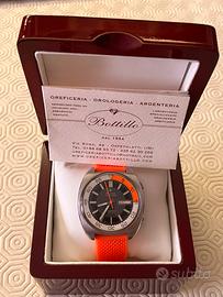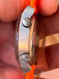 •✔️ Movimento 2182 originale (giorno + data) •✔️ Cassa cushion tipica Snorkel •✔️ Ghiera interna con primi 15 min evidenziati •✔️ Quadrante corretto “Snorkel 666 Feet” •✔️ Corona a ore 4 (tipico serie 218) Caratteristiche: •diapason a 360 Hz (non bilanciere) •secondi perfettamente continui (non a scatti) •sistema elettromeccanico con transistor •complicazione day-date In vendita pezzo spettacolare della mia collezione, revisionato documentato, perfettamente funzionante, regolato ovviamente per le moderne batterie in commercio. Diametro larghezza 41,3mm. Chi offre al ribasso guardi prima quanto speso per revisione e restauro cassa. Non è impermeabile, documentarsi bene prima di offrire o chiedete a me informazioni su questi movimenti particolari non riparabili da chiunque…no restituzioni per ignoranze varie. No garanzia essendo un privato. Cinturino silicone after a sgancio rapido.