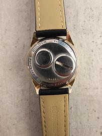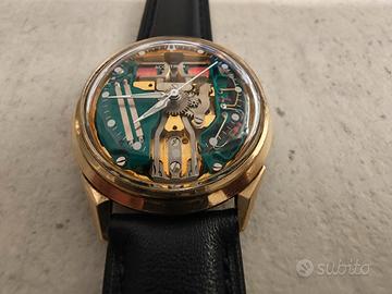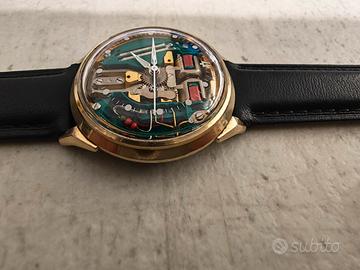 Bulova accutron spaceview M3 del 1963 con cassa placata oro 10 kt da 34 mm. L orologio è appena stato revisionato da esperto Bulova e tarato per un corretto funzionamento con le attuali batterie da 1,55v. Perfettamente funzionante. Bracciale nuovo il pelle nera, generico.
