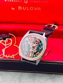 Completano l’orologio, in eccellenti condizioni estetiche e di funzionamento, il cinturino (in lucertola), la fibbia, la scatola, la controscatola e il tag originali Bulova dell’epoca.