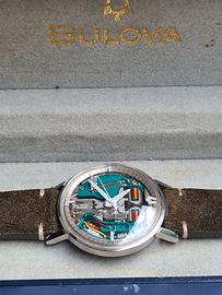 Spettacolare Bulova accutron Spaceview originale e molto raro in queste condizioni, del 1964 cal214 , perfettamente funzionante con servizio effettuato da poco da un tecnico che sa revisionare questi orologi, tarato per funzionare perfettamente con le pile di facile reperibilità, sono delle normali pile da 1,55 v, cinturino generico in pelle scamosciata fibbia generica no permute no scambi .