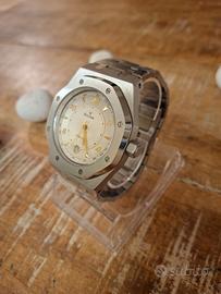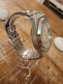 In vendita un particolare orologio originale Bulova con un movimento, quadrante e set di lancette originali Bulova risalenti agli anni 2000, re-incassato in una cassa aftermarket con bracciale integrato.