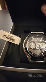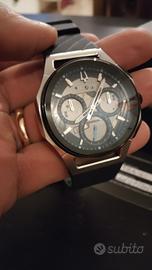 Bulova Curv Progressive, noto per essere il primo cronografo al mondo con un movimento curvo. Il modello specifico mostrato se Curvmbra essere il98A161, caratterizzato da una cassa in acciaio inossidabile da 44 mm con finiture nere e un cinturino in gomma nera con trama. Esistono varianti simili, come il modello98A162in titanio o il96A205con accenti blu Caratteristiche principali Movimento:Tecnologia al quarzo ad alte prestazioni con una frequenza di vibrazione di262 kHz, che garantisce un'altissima precisione. Design:La cassa e il movimento sono ergonomicamente curvi per adattarsi meglio al polso. Quadrante:Grigio scuro/nero scheletrato con lancette e indici luminescenti. Vetro:Cristallo di zaffiro curvo. Resistenza all'acqua:Fino a 30 metri (3 bar). potete contattarmi per qualsiasi informazione o foto,l orogio comprato e tenuto in scatola è ancora in garanzia come si vede nella foto presente anche il costo solo spedizione nessuna consegna a mano
