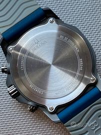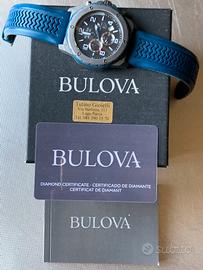 Cronografo BULOVA Marine Star W.R. 100 metri con movimento al quarzo di produzione svizzera - perfetto di estetica e di funzionamento - dotato di tutto il suo corredo originario (come visibile in foto) - cassa in ceramica di 44mm di diametro e fondello in acciaio - quadrante nero con lancette luminescenti e piccoli contatori cronografici tono su tono - corona con logo - cristallo minerale - cinturino originale in silicone blu e di colore grigio al retro con la scritta Bulova al retro e sulla fibbia