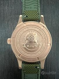 Movimento automatico calibro 83SO con riserva di carica fino a 60 ore. Cassa in bronzo da 41mm con quadrante verde, vetro zaffiro bombato, cinturino in cordura verde con chiusura a fibbia. Bellissimo il fondello a vite con palombaro a rilievo, ghiera girevole a pressione.