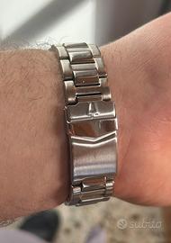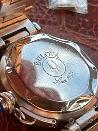 Orologio vintage Bulova, che si rifà agli stilemi del famosissimo Pasha, totalmente in acciaio, sia cassa che bracciale, diametro cassa di 39 senza corona, quadrante bianco con lavorazione a trama concentrica, numeri romani con datario a ore 4, in corrispondenza del datario il vetro presenta la lente per ingrandire il numero. La corona presenta un cabochon con pietra blue, ha la chiusura a vite con la catena classica di questo modello, cinturino con clasp logata, fondello in acciaio con logo, segnatempo con movimento al quarzo, testato è perfettamente funzionante in ogni sua funzione, condizioni veramente ottime considerato che è comunque un’orologio vintage, l’orologio verrà fornito di un’altra maglia aggiuntiva come si vede anche dalle foto.