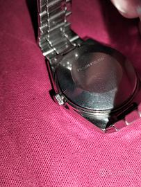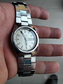 Un classico degli anni '70, automatico Bulova con desing pulito e discreto,dotato di una pratica complicazione giorno-data, Prodotto dalla divisione Caravelle per il mercato europeo, questo modello monta un affidabile movimento automatico svizzero 23 rubini, cal 11AOACB, dimensione cassa 37,2 x 43mm. Tutto in acciaio inossidabile. Quadrante argento a riflessi solari, con indici applicati e lancette argentate/nerastre. Bracciale in acciaio inox con chiusura a deployante. Adatto a polsi fino a 20cm di circonferenza. Condizione ottime, con piccoli segni di usura coerenti con l'età. No scatola originale.