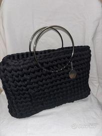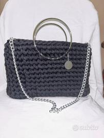 ✨ Scopri l’eleganza artigianale che fa la differenza. Questa borsa realizzata a mano unisce stile e unicità in un design moderno e raffinato. Il tessuto intrecciato nero dona carattere e personalità, mentre i manici metallici circolari aggiungono un tocco di classe senza tempo. Perfetta per chi cerca un accessorio originale, versatile e di qualità, capace di valorizzare ogni outfit — dal casual chic alle serate più eleganti. 💫 Un dettaglio che parla di te.