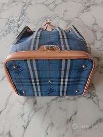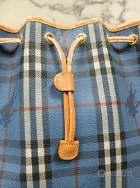 Borsa a secchiello vintage Burberry con check classico su base azzurra.