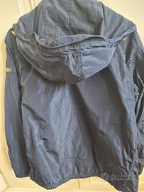 Giacca impermeabile con cappuccio, sfoderato. Molto pratica taglia 52 ma veste benissimo dalla 44 in poi . pezzo originale con un piccolo difetto nella targhetta sopra la manica a cui manca la R. per il resto la giacca è in condizioni eccezionali