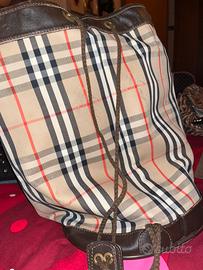 Chiusura con coulisse, occhielli in metallo dorato e toppa ovale in pelle con logo in rilievo e fantasia haymarket check. Realizzata in tela