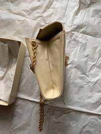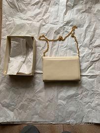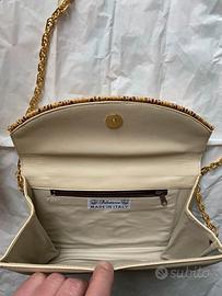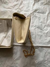 Per Appassionati del vintage o collezionisti, ecco una bella busta in pelle Tender / Pitone codice MM 0835 anni 1960 tinta ghiaccio Marca Pelletteria Made in Italy. Dettagli :Busta con pattina chiusura a bottone magnetico ottonato, con bacchetta tonda con estremi in metallo ottonato rivestito in pelle di pitone con anelli per tracolla e catena ottonata, interno tasca con cerniera Lati interni si sollevano sono proprio fatti così. Scatola originale con carta di protezione. Si notano due piccole impronte dei anelli porta catena sui lati opposti dei medesimi poco visibili. Mai usata come nuova ben tenuta ottimo stato di conservazione. Dim: 22,3 x 16,4 x da 4 a 5 cm spessore.