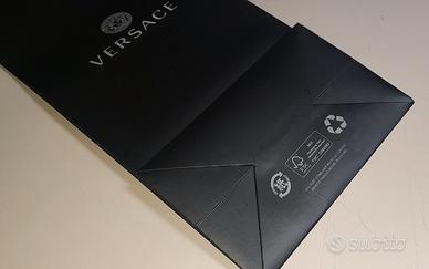 Vendo elegante busta regalo originale Versace, di colore nero opaco con logo argentato e iconico simbolo Medusa al centro. Realizzata in cartoncino rigido di alta qualità, dotata di due manici in corda nera, perfettamente integri.