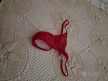Bustier con penne applicate alla coppa seno completo di perizoma a filo con strass. Colore rosso, tessuto garzato morbidissimo, tg. S