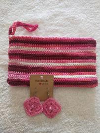 Coordinato bustina e orecchini fatti a mano in puro cotone. Bustina foderata con cinturino polso e chiusura a bottone. Mis. 11 x 20. orecchini a scelta nei due modelli in foto con monachella anallergica.
