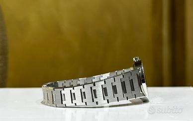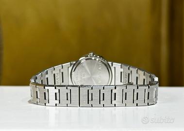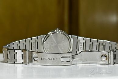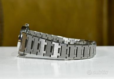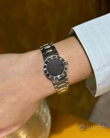 Orologio completamente originale in tutte le sue parti. Il Bvlgari Lady BB26SSD è uno dei modelli più rappresentativi della collezione Bvlgari Bvlgari, un perfetto equilibrio tra design iconico, raffinatezza e versatilità quotidiana. Pensato per il polso femminile, unisce estetica minimalista e dettagli distintivi tipici della maison romana. Questo segnatempo si distingue per la sua cassa in acciaio da 26 mm, elegante e discreta, ideale per chi ama orologi raffinati ma non eccessivi. La vera firma estetica è la lunetta incisa con il doppio logo BVLGARI BVLGARI, elemento iconico che richiama le antiche monete romane e dona forte riconoscibilità al modello. Il quadrante nero, essenziale e pulito, esalta la leggibilità e conferisce un look sofisticato, perfetto sia per l’uso quotidiano che per occasioni più formali. Cassa e bracciale: acciaio inox Vetro: zaffiro antigraffio Diametro: 26 mm Impermeabilità: circa 2–3 ATM La costruzione è solida ma confortevole al polso, con un bracciale integrato che mantiene una linea continua ed elegante. Il BB26SSD è dotato di movimento al quarzo, sinonimo di precisione e praticità. Perfetto per chi cerca un orologio elegante ma utilizzabile tutti i giorni Ideale come primo orologio di marca importante Ottima scelta anche come regalo grazie al design intramontabile