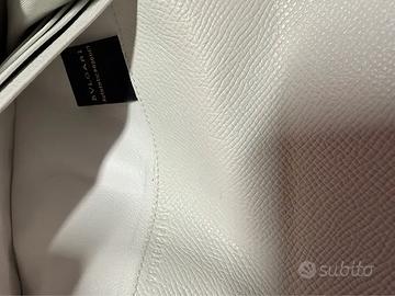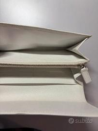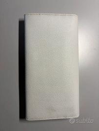 Bellissimo portafoglio donna Bvlgari originalee autentico (vedi foto etichetta e codice seriale), in ottime condizioni, usato pochissimo. Il portafoglio è in vera pelle, color bianco-latte, con fibia rotonda argentata con trama Bvlgari. Il portafoglio presenta 4 vani/scomparti, di cui uno con cerniera, e 10 porta tessere/carte di credito. Le condizioni sono ottime, utilizzato pochissimo, solo qualche segno di normale usura sul retro. Affare!!!