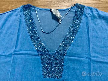 Caftano mare da donna, color celeste con collo a V e dettaglio in pailettes.