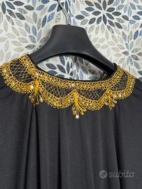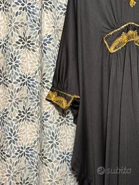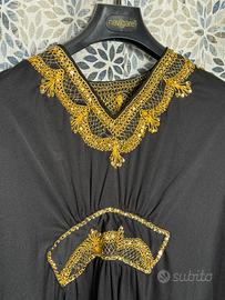 Caftano nero da donna con ricami dorati su scollo e maniche. Linea ampia e fluida, stile elegante e raffinato. Perfetto per cerimonia, eventi, serate o look etnico chic. Comodo, leggero e molto scenografico. Ottime condizioni.