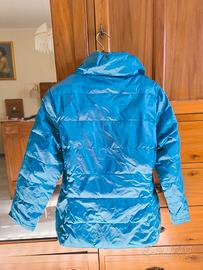 Caldo piumino da donna azzurro in vera piuma d'oca - real down 90/10, taglia XL, con colletto e tasche con chiusura a zip. Tessuto esterno 100% nylon, fodera 100% poliestere. Vendita da privato con clausola "visto e piaciuto"