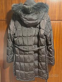 Piumino trapuntato donna color prugna lunghezza sopra al ginocchio, con cappuccio bordato in pelliccia, linea dritta con cinturetta annodabile