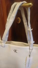 Vendo borsa nuova, in pelle bianca e fodera nera Kalvin Klein, modello shopper misure L 36 sotto, 46 sopra H 32 P10. Manici ancora con protezioni, e con etichetta. 90 €