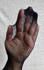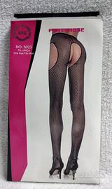 Interamente in rete piccola sia sulla coscia che sulla striscia verticale che collega la calza all'elastico in vita (in pratica è un collant a rete normale aperto sotto e al lato sui fianchi).