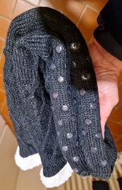 Calze antiscivolo nere con motivo a treccia, bordate di pelliccia bianca e foderate di pile.
