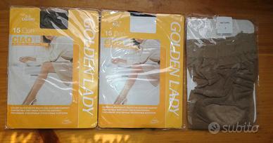 Vendo a 2 euro al paio varie confezioni di collant nuovi: - 1 paio collant Vignoni nero misura 1/2 small, 70 denari, coprente opaco - 1 paio collant Pompea nero misura 2-s, 50 denari, in microfibra e linel, coprente, corpino indemagliabile, tassello in microfibra - 2 paia collant Pompea classico no stress 20 denari, color playa, misura 1/2-s, opaco, pratico e comodo, corpino rinforzato, cinturino soft, punte nude - 2 paia Collant elasticizzato Golden Lady 15 denari.