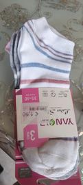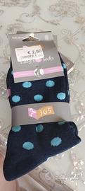 Due set da 3 paia di calze. Uno è un set di calze corte, taglia 35-40, fantasie a pois, con elementi antiscivolo. L'altro è un pacco da 3 paia di fantasmini, fantasia a righe e brillantini, taglia 35-40.