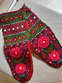 Calzettoni in maglia decorati con motivi geometrici e floreali in vari colori come rosso, verde, blu scuro e fucsia con design che richiama lo stile tradizionale nordico o dell'Europa dell'Est