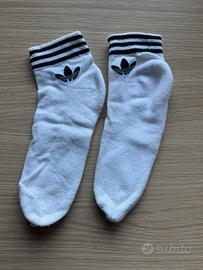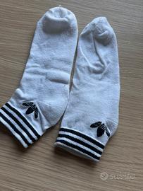 Un paio di Calzini Adidas corti con logo. Design a fantasia con righe nere sul bordo. Logo Adidas trefoil sul lato. Numero 40-42 Cotone felpato Nuove Modello, colore, condizioni in foto