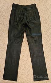 Vendesi calzoni in vera pelle, taglio jeans e colore nero, come nuovi. Ampiezza vita 36 cm, lunghezza da giro vita ad orlo calzoni 110 cm.
