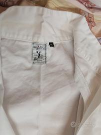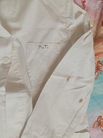 Camice da laboratorio di colore bianco. - Maniche lunghe con elastico ai polsi. - Due tasche frontali. - Chiusura con bottoni. - Collo a camicia. 2 macchie e iniziali nome