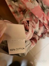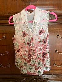 Camicetta con sfondo bianco e e fiori rosati e verdi, più corta sul davanti. Buone condizioni. Veste S . 100% cotone.