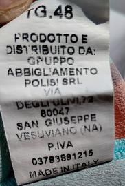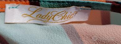 camicetta a righe presenta uno stile casual ed elegante. È caratterizzata da righe verticali nei toni dell'arancione, del celeste e del bordeaux, con uno scollo rotondo e un dettaglio a fessura sul davanti con gancetto metallico per chiusura. Taglia 48