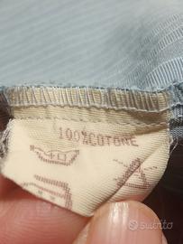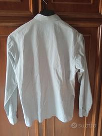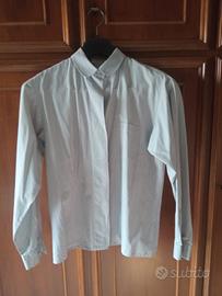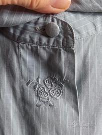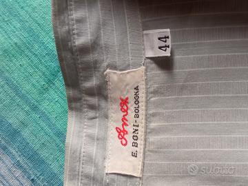 Romantica e sportiva allo stesso tempo. con Tasca. Sfondo grigio perla a righe bianche. Bottoni di stoffa al collo e ai polsini, gli altri di madreperla. Un bottone di scorta. Bottoni a scomparsa, coperti da un profilo ricamato. Spalle 44, lunghezza 64, manica 59 dalla spalla. Molto originale! Puro cotone, marca AMEX, E. Boni , Bologna. Tg 44.