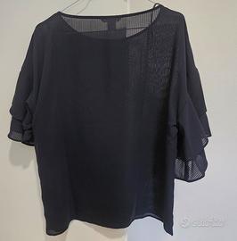 Vendo camicetta blu scuro di H&M con maniche corte volant. Non aderente, scende morbida. Leggermente trasparente ma si può indossare senza canotta sotto. Taglia S. Ottime condizioni. Si trova a Ravenna ma è possibile spedizione.