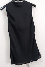 Sottogiacca, camicetta smanicata in satin di colore nero lucido con scollo morbido.