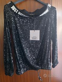 camicetta nuova in paillettes nera con scollo elastico a barchetta,nuova ancora con cartellino
