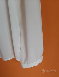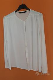 Camicetta fluida color crema con maniche lunghe, chiusura frontale a bottoni e dettagli arricciati sulle spalle. Brand Zara , tessuto poliestere . Presenta una piccola imperfezione (vedasi ultima foto)